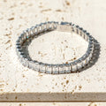 This elegant bracelet features stunning emerald cut stones, each stone weighing 0.5 carats. The unique cut of the stones exudes a sense of luxury and sophistication, adding a touch of elegance and beauty to any outfit. The simple design of the bracelet makes it easy to match with any style, while the high-quality materials and exquisite craftsmanship make it a luxurious and exquisite item of jewelry. This bracelet is perfect for any woman looking for a timeless and elegant accessory that exudes beauty and class. It is versatile enough to be worn on any occasion, adding a touch of luxury and glamour to your look. This bracelet is sure to become a cherished item in your jewelry collection, adding a sense of womanly charm and sophistication to your everyday look.